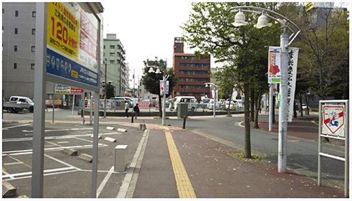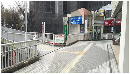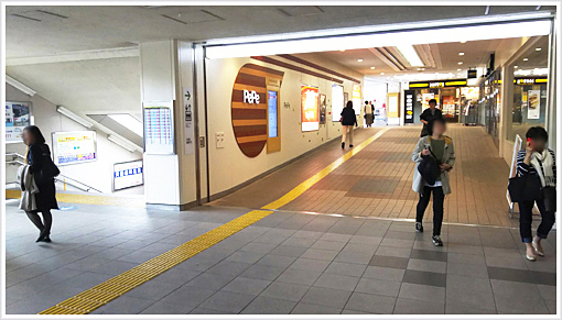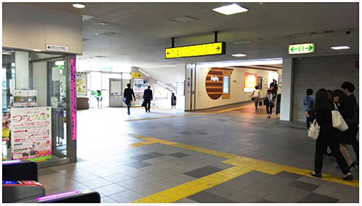 改札を背に左側に見える階段の隣の通路へお進みください。 (階段を降りると少し遠回りになります)